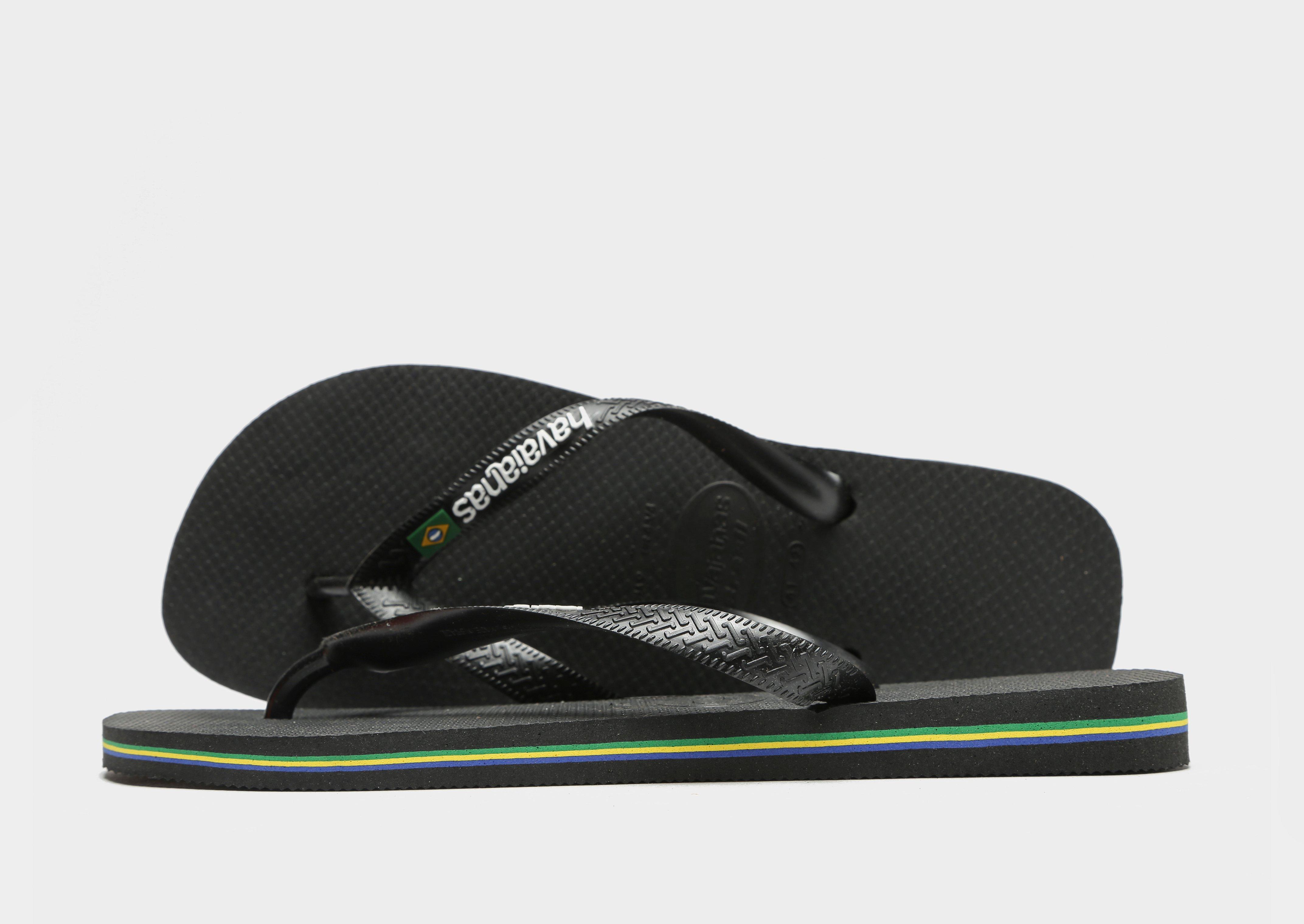 Unas chanclas de hombre sencillas con el sello brasileño de Havaianas. Son de color negro y decoradas con la bandera de Brasil. La superficie está texturizada para que vayas cómodo con ellas. Es un calzado fresco para llevar durante todo el verano.