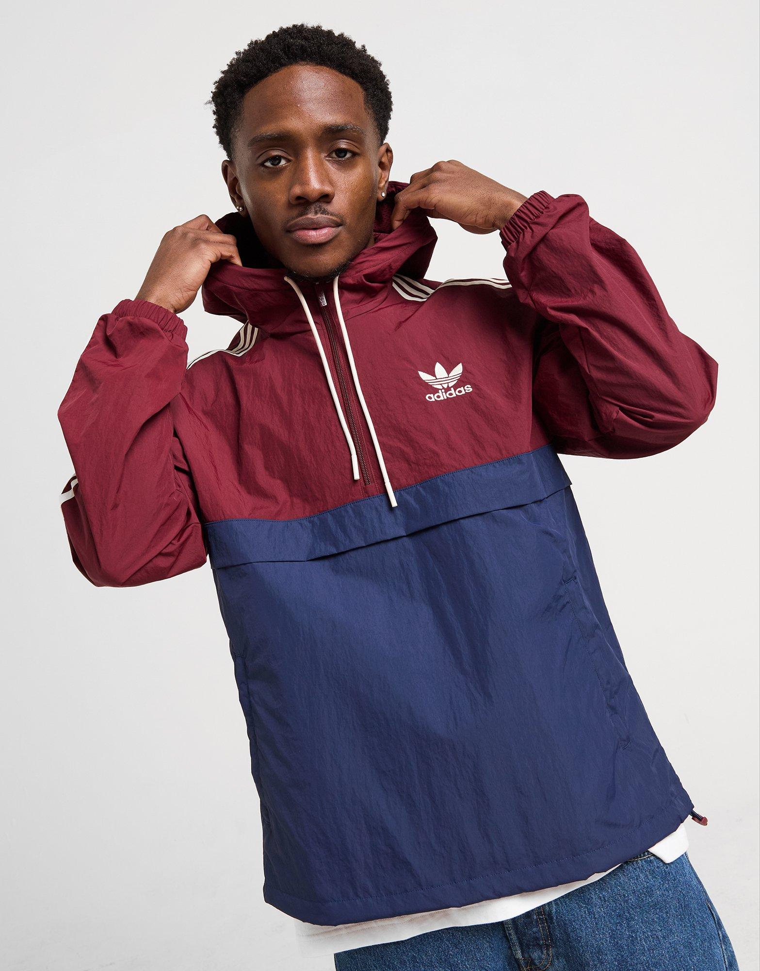 Vence al mal tiempo con esta chaqueta cortavientos Overhead 1/2 Zip de adidas Originals para hombre. En una combinación de colores rojo sombra y azul marino, esta chaqueta exclusiva de JD está confeccionada en poliamida reciclada ligera y transpirable para protegerte. Tiene un cierre de 1/2 cremallera y capucha para una cobertura personalizada, con ribetes acanalados para mantener la forma y un dobladillo ajustable para que puedas ceñirla. Con bolsillos laterales para guardarla, está rematada con el Logo Trefoil en el pecho. Lavable a máquina | Nuestra modelo mide 1,70 m, mide 96,52 cm de pecho y lleva la talla M. | JX5779